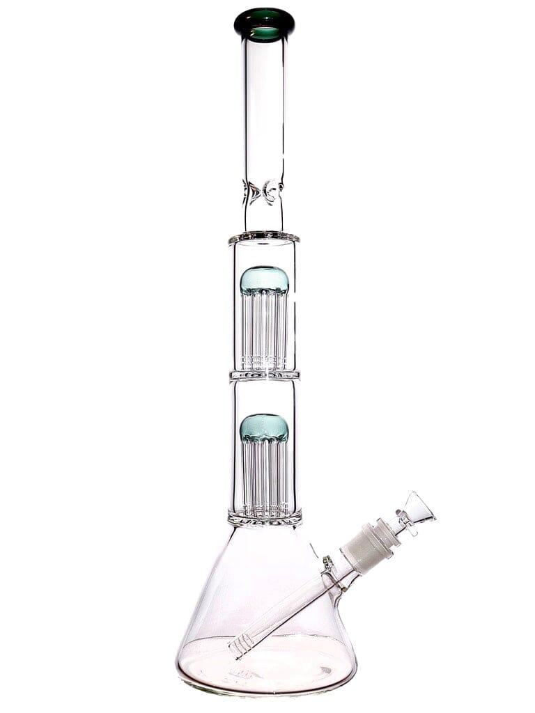 Classic clear 18 inch double tree-perc beaker bong with clear color accents. Features an elongated neck, ice pinches, double tree-percs and a 14mm bowl size.
