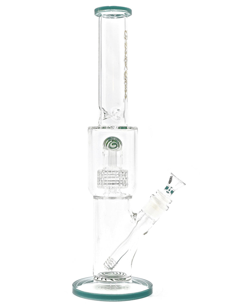 Classic style by Crystal Glass. This straight tube is a nice and thick, yet compact bong, with a matrix perc that gives extra bubble filtration on top of the 7 hole downstem diffuser. Displays a mesmerizing wig-wig pattern on the base and the dome of the perc chamber that puts it above the rest. Comes with downstem and bowl. Stands 15 inches in height.