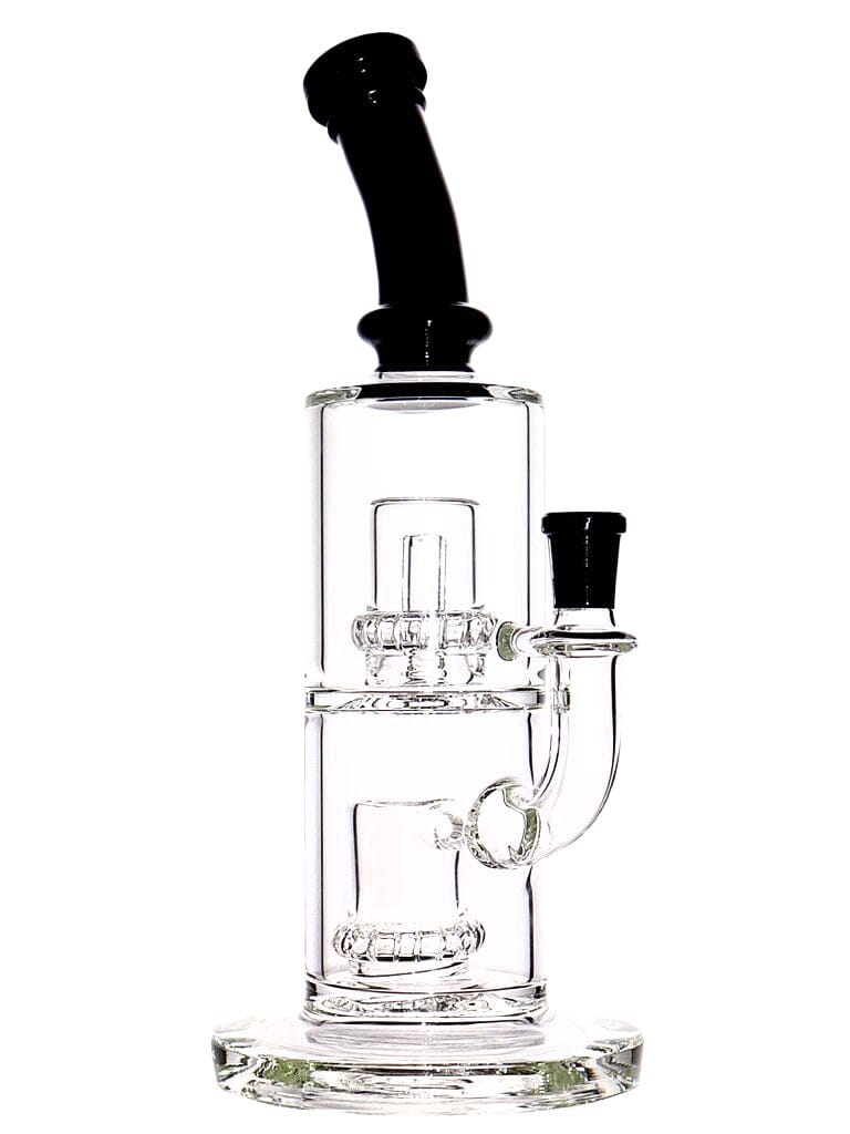 A clear double chamber borosilicate glass water rig, featuring double matrix and showerhead percs, with milky color accents. Comes with 14mm male flower bowl.