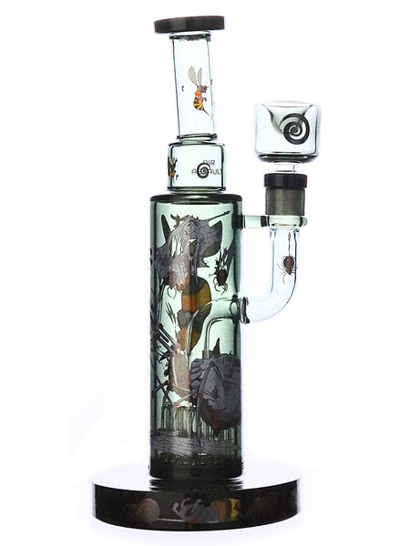 Released in February of this year 2023, these new rigs by Wormhole Hole follow in continuation with the Robo-Bees storyline. In this scene, you can see a giant Robo-Bee trying to attack the Archna-Zombie Queen with an aggressive air assault. Around the base of the rig, you can see all the Archna-Zombie colony scrambling to save their Queen! Stands 9 inches in height, with a wide base. Wormhole brand decals on base, splashguard, and flower bowl.